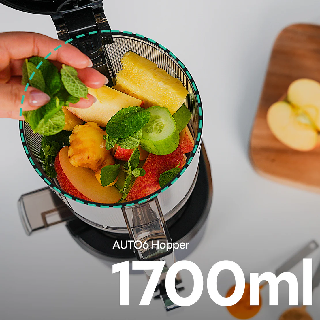 - 1.7L large auto hopper, auto-cut juicing